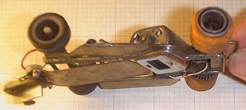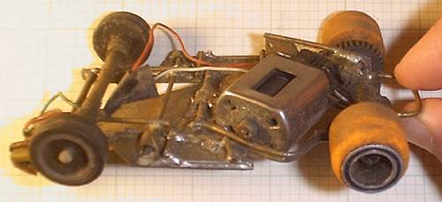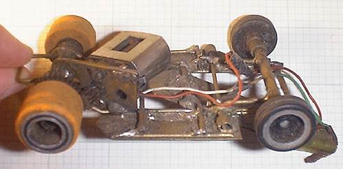 These pictures were taken before I cleaned the chassis. This is how some vintage slot car chassis look as they arrive in the collector's hands - dirty, grimey, broken, in need of TLC and some restoration!